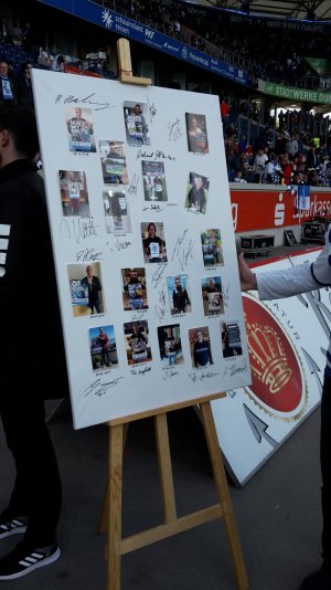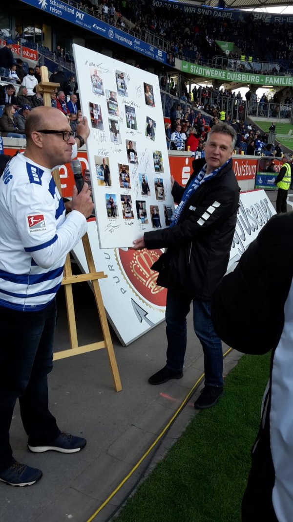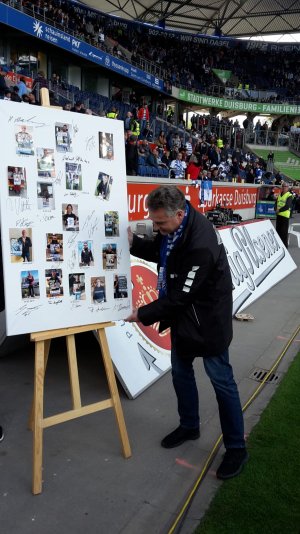 Diese Leinwand wurde nun am letzten Heimspiel durch Stefan Leiwen an den Vorsitzenden des MSV-Museums - Volker Baumann - übergeben. Natürlich erst nachdem Andreas Haremski, die Legende des letzten Heimspiels der Saison, sein Foto unterzeichnet hatte.