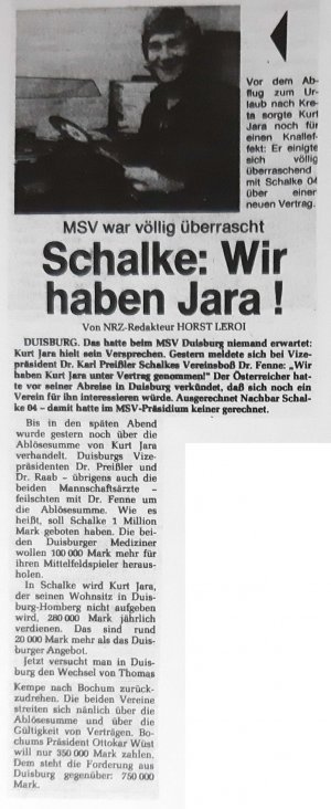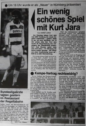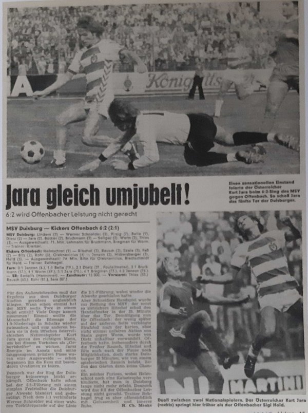 Wie sich herausstellen sollte: ein gewaltiger Glücksgriff! Jara wurde für 140.000 DM verpflichtet. Am Mittwoch zog Familie Jara von Valencia nach Duisburg, am Samstag stand Kurt schon in ZebraStreifen auf dem Platz gegen die Kickers aus Offenbach und zauberte die Zebras zum 6:2 Sieg. Dabei erzielte er auch seinen ersten Treffer. Die glorreiche Zeit des Kurt Jara mit und beim MSV hatte eindrucksvoll begonnen.