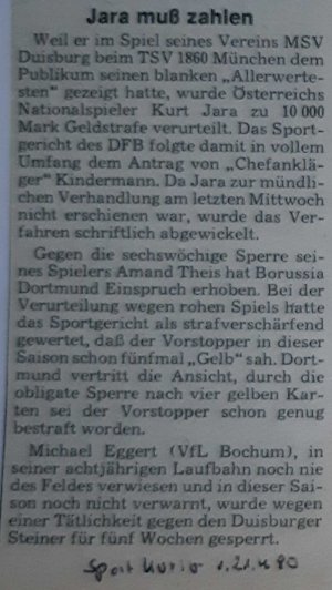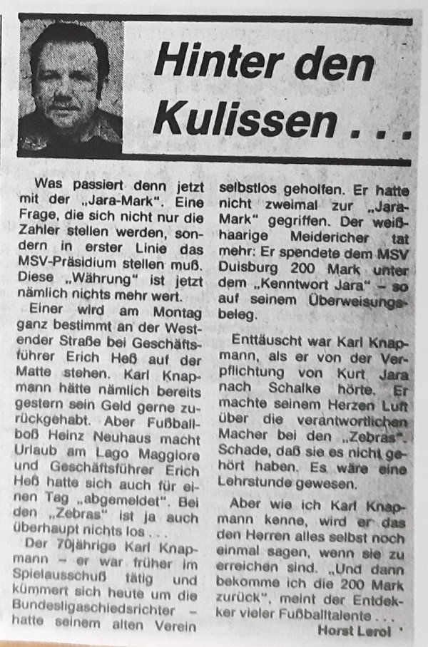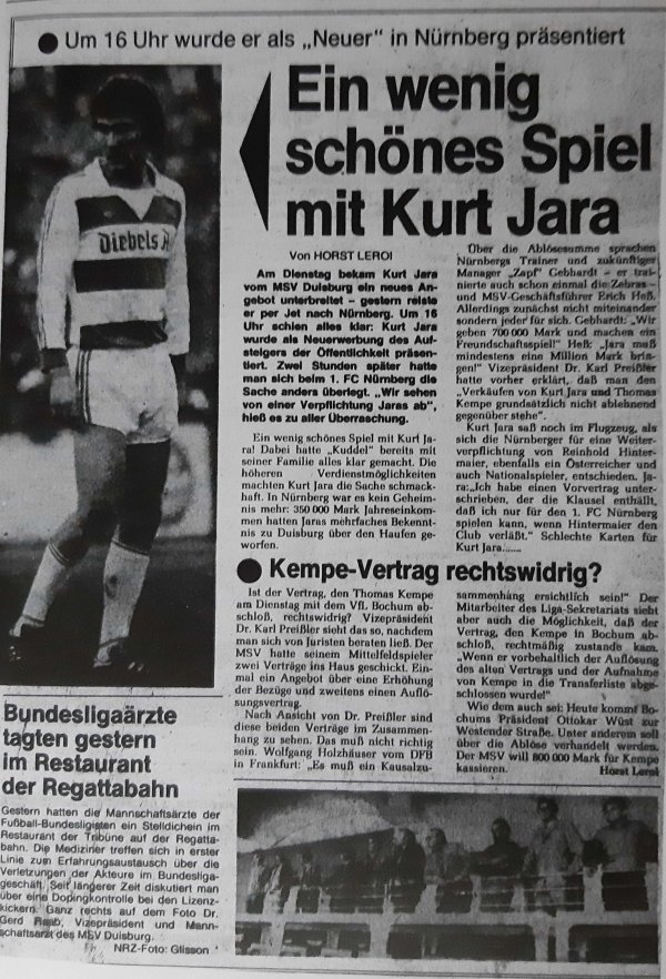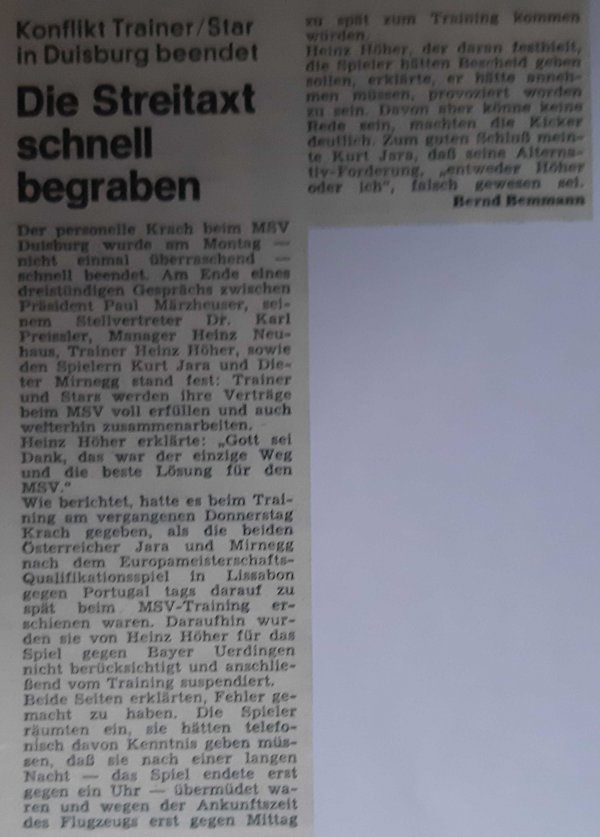 Kommen wir nun noch zu drei weitere Gegebenheiten, die immer mit Kurt Jara und dem MSV in Verbindung gebracht werden. Da wäre zum einen ein persönlich unschöner Moment zu nennen, als Heinz Höher, der damalige Trainer der Zebras, Kurt Jara und seinen österreichischen Nationalmannschaftskollegen Hans-Dieter Mirnegg in der Saison 1979/80 vor dem wichtigen Spiel gegen Uerdingen (1:1) aus dem Kader strich. Grund dafür war ein Zuspätkommen zum Training am Donnerstag vor dem Spiel. Und Grund dafür war das Europameisterschafts-Qualifikationsspiel von Österreich tags zuvor in Lissabon. Nach dem Spiel setzen sich die Protagonisten beim Boss Märzheuser an einen Tisch und räumten ihre Fehler ein. Alles war wieder gut.