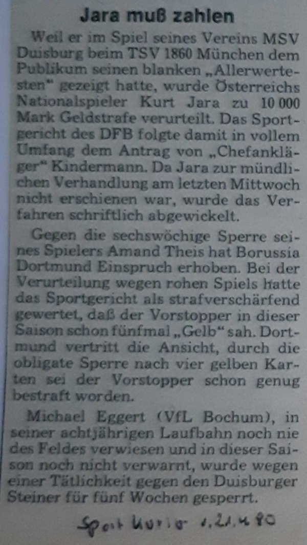 Dann musste Kurt Jara in der Saison 1979/80 eine Geldstrafe von 10.000 DM an den DFB zahlen – er hatte im Duell bei TSV 1860 München dem Publikum seinen „Allerwertesten“ gezeigt!