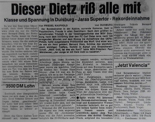 Nicht das einzige Traum-Tor in ZebraStreifen. Ein weiteres gelang ihm am 1. November 1978 in der 2. Runde des UEFA-Cup im Spiel gegen Carl Zeiss Jena, als er in der 107. Minute zum 2:0 einnetzte. Der MSV gewann das Spiel mit 3:0 nach Verlängerung und zogen damit ins Achtelfinale ein. Am Ende erreichten die Zebras das Halbfinale, das dann gegen Borussia Mönchengladbach, den späteren UEFA-Cup Sieger, verloren ging. Das Erreichen dieses Halbfinals war wohl der größte Erfolg von Kurt Jara im Dress der Zebras.