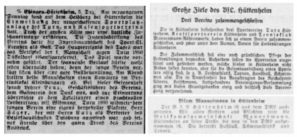 Quellen: Archiv des MSV Museum e. V. // Platzweihe in Ehingen-Hüttenheim, in: RRZ, 03.12.1921, Nr. 511, S. 3;Ehingen-Hüttenheim, Ebd., 07.12.1921, Nr. 516, S. 3; Der T.-V. Huckingen aus seinem Schlaf erwacht, in: DGA, 11.07.1924, Nr. 250, S.5; Neue Sportplatzanlage in Hüttenheim, Ebd., 12.02.1930, Nr. 72, S.4; Der Turn- und Sportverein Huckingen, in: DGA, 20.09.1933, Nr. 259,S. 14; Große Ziele des VfL. Hüttenheim, in: RRZ, 05.09.1935, Nr.245, S. 6; Wkgm Mannesmann in Duisburg, in: DGA, 16.02.1938, Nr. 46,S. 8; Bezirksklassenreife für Mannesmann, Ebd., 15.05.1939, Nr. 132, S. 9; Spitzengruppe erneut vor Bewährungsprobe, Ebd., 16.12.1939, Nr. 345, S. 4; Die erwartete Punkteteilung, Ebd., 18.12.1939, Nr. 347, S. 5; Mannesmann– Meidericher SpV. 1:1 (1:0), in: RRZ, 18.12.1939, Nr. 346, S. 3;SaftigeAbfuhr für den Meidericher Spielverein, in: DGA, 04.03.1940, Nr. 64,S. 3; Was war da in Meiderich los?, in: RRZ, 04.03.1940, Nr. 63, S.3; th.: Bei Mannesmann unentschieden, Ebd., 16.09.1940, Nr. 255, S.3; Dem Spielverlauf entsprechend, in: DGA, 16.09.1940, Nr. 256, S. 5; Über Gebühr hart, Ebd., 27.01.1941, Nr. 27, S. 4; Schafft Holten es noch?, Ebd., 28.07.1941, Nr. 206, S. 4; Meiderich muss Punkt abgeben, Ebd., 24.11.1941, Nr. 325, S. 3; „Zebranachwuchs“ schaffte es, Ebd., 08.03.1943, Nr. 67, S. 3 // Von Roden, Günter: Geschichte der Stadt Duisburg. Band 2: Die Ortsteile von den Anfängen. Die Gesamtstadt seit 1905. 2Duisburg1979; Luh, Andreas (2008): Fußball im Firmen- und Behördensport, in: Peiffer, Lorenz/Schulze-Marmeling, Dietrich (Hrsg.): Hakenkreuz und rundes Leder. Fußball im Nationalsozialismus. Hildesheim: Verl.Die Werkstatt, S. 153-165; Becker, Frank/Schäfer, Ralf (Hrsg.)(2016): Sport und Nationalsozialismus. Hildesheim: Wallstein; Dembowski, Gerd/Piesczek, Dirk/Riederer, Jörg: Im Revier der Zebras. Die Geschichte des MSV Duisburg. Göttingen 2001; 50 Jahre VfL Duisburg-Hüttenheim. 20. Juni bis 28. Juni 1970. [Duisburg 1970];100Jahre TuSpo Huckingen. Aus der Vergangenheit in die Zukunft![Duisburg 1998]; [Mronga, Mario]: Geschichte: VfL Duisburg Süd 1920e.V., in: SG-Duisburg-Sued.de, o. D.,www.sg-duisburg-sued.de/geschichte/vfl-duisburg-süd-1920-e-v.